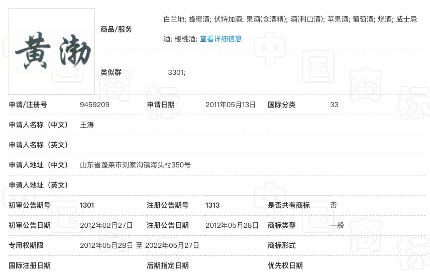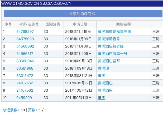 所以有头有尾,我们知道了,一名叫做王某的人,在2011年的时候,在第33类酒产品上注册了一个“黄渤”商标。