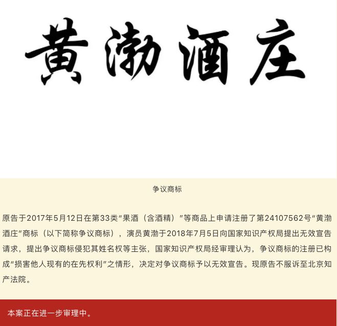 进一步,根据商标局数据显示,目前,后注册的“黄渤酒庄”也被无效宣告中。官司也已经打到了北京知识产权法院。